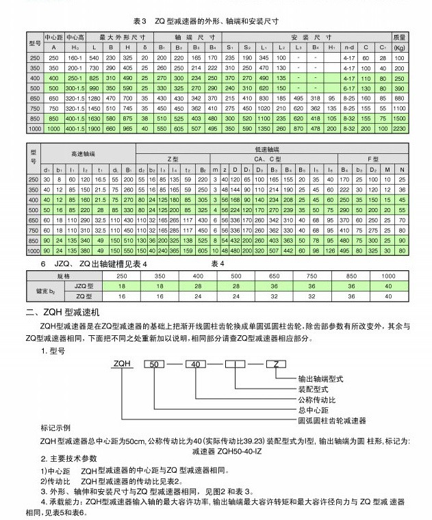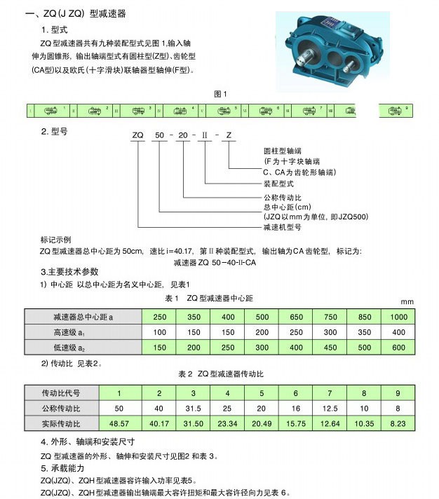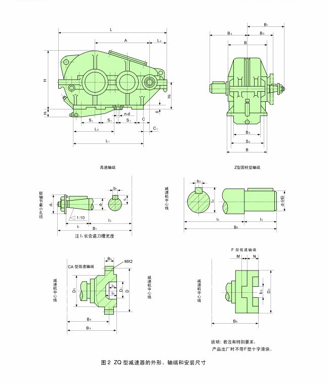 5、此類減速機傳動比有:48.57、40.17、31.5、23.34、20.49、15.75、12.64、10.35、8.23。   ZQ型減速機有兩級傳動,裝配型式共有九種,輸入軸伸為圓錐形,輸出軸端由圓柱形(Z型)、齒輪型(CA型、C型)一級歐氏(十字滑塊)聯(lián)軸器(F型)。